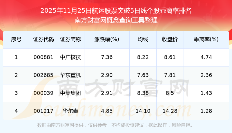 根據(jù)南方財(cái)富網(wǎng)概念查詢工具數(shù)據(jù)統(tǒng)計(jì),截止2025年11月25日收盤,航運(yùn)股票共有4只個(gè)股收盤價(jià)向上突破了5日線。其中乖離率較大的個(gè)股有中廣核技、華東重機(jī)、中集集團(tuán)等,乖離率分別為4.74%、2.36%、1.43%。