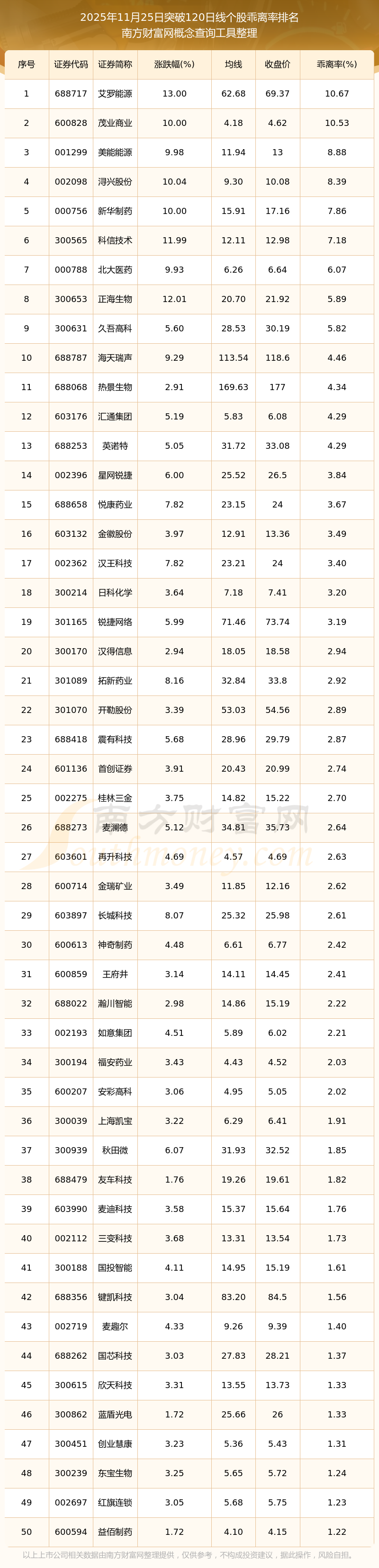2025年11月25日突破120日線個(gè)股乖離率排名