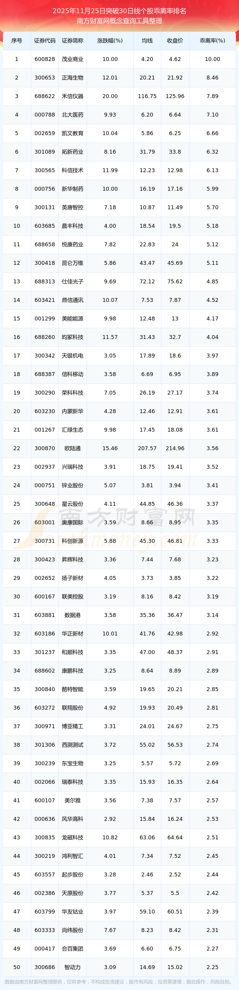 2025年11月25日突破30日線個(gè)股乖離率排名