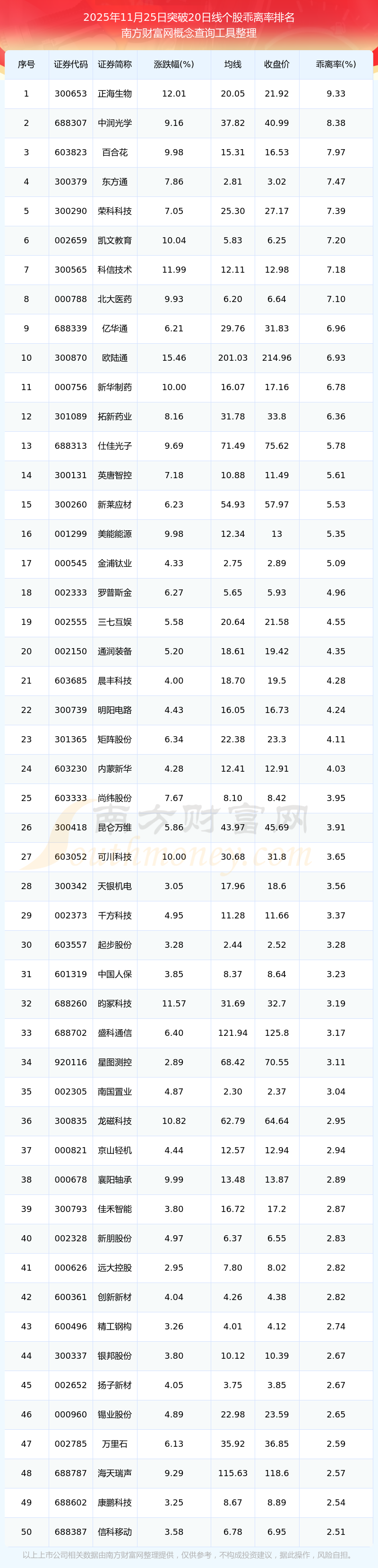 2025年11月25日突破20日線個(gè)股乖離率排名