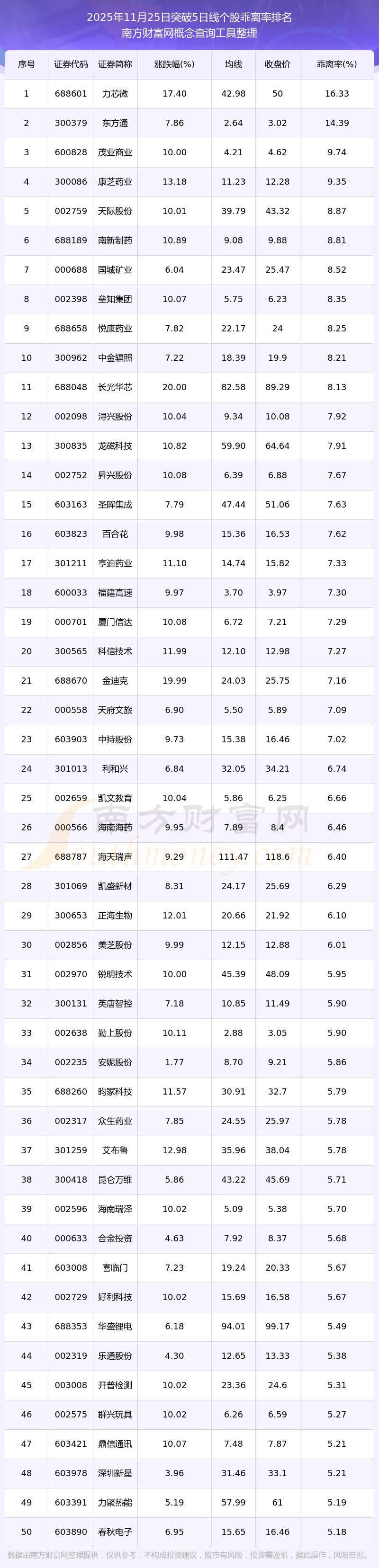 根據(jù)南方財富網(wǎng)概念查詢工具數(shù)據(jù)統(tǒng)計,截止2025年11月25日收盤,共有249只個股收盤價向上突破了5日線,其中乖離率較大的個股有力芯微、東方通、茂業(yè)商業(yè)、康芝藥業(yè)、天際股份等,乖離率分別為16.33%、14.39%、9.74%、9.35%、8.87%。