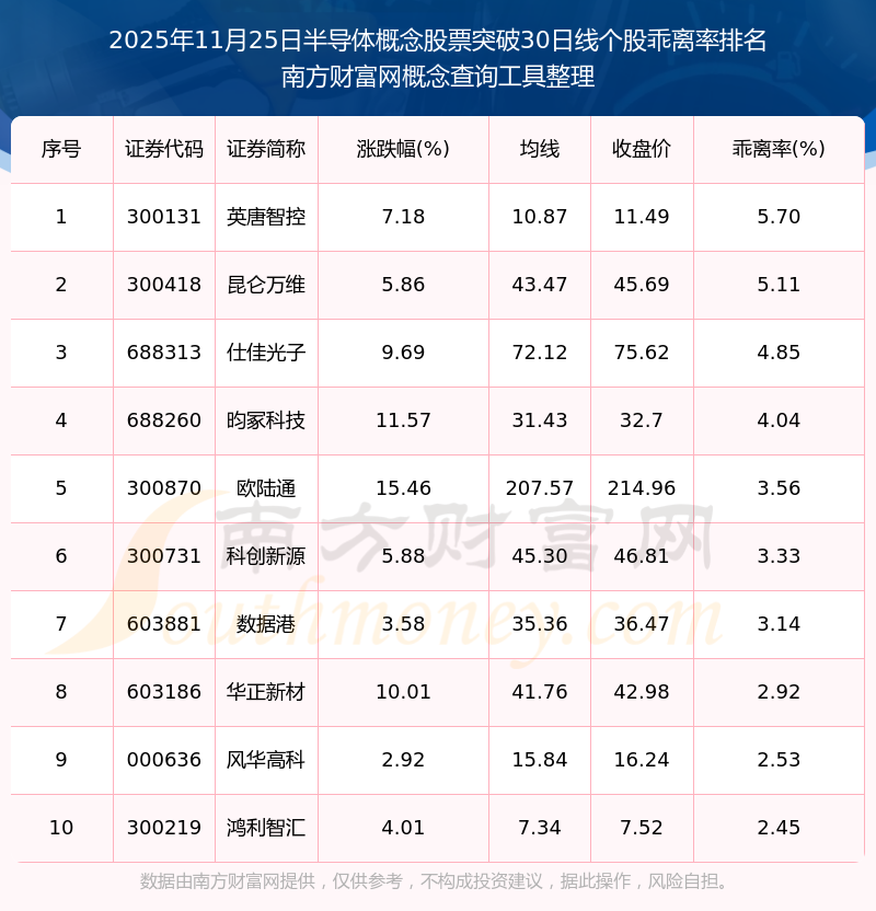 2025年11月25日半導(dǎo)體概念股票突破30日線個(gè)股乖離率排名