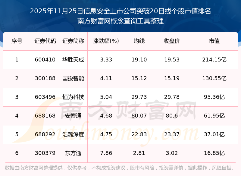 2025年11月25日信息安全上市公司突破20日線個(gè)股市值排名