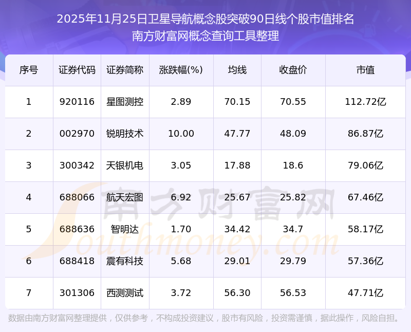 根據(jù)南方財富網(wǎng)概念查詢工具數(shù)據(jù)統(tǒng)計,截止2025年11月25日收盤,衛(wèi)星導航概念股共有7只個股收盤價向上突破了90日線。其中市值較大的個股有星圖測控、銳明技術、天銀機電等,市值分別為112.61億、86.87億、79.06億。