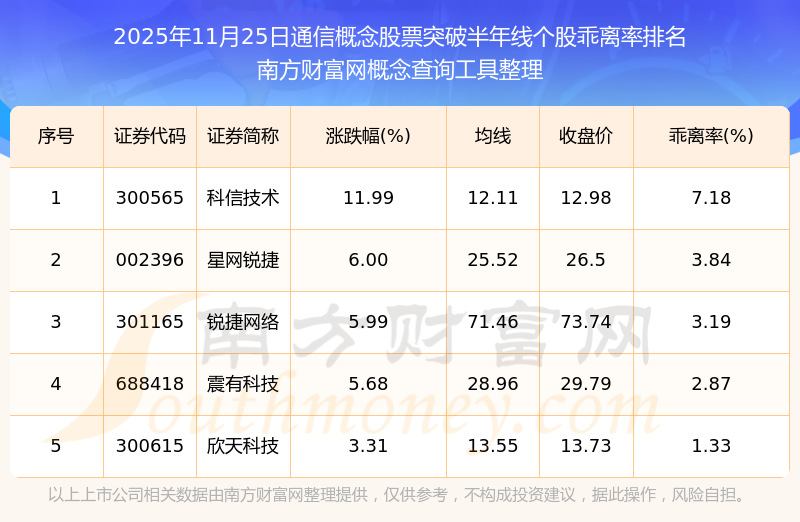 根據(jù)南方財富網(wǎng)概念查詢工具數(shù)據(jù)統(tǒng)計,截止2025年11月25日收盤,通信概念股票共有5只個股收盤價向上突破了半年線。其中乖離率較大的個股有科信技術、星網(wǎng)銳捷、銳捷網(wǎng)絡等,乖離率分別為7.18%、3.84%、3.19%。