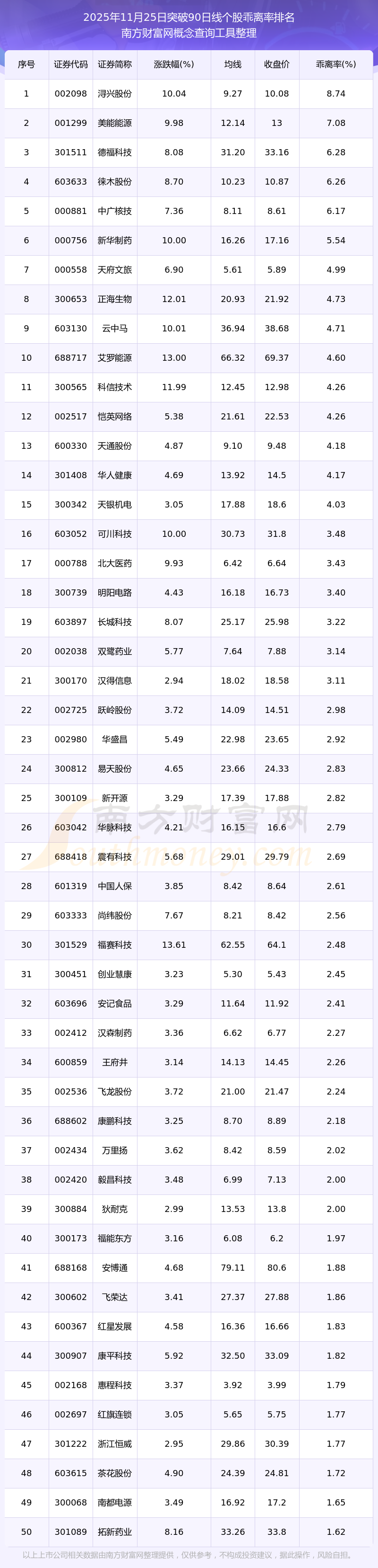 2025年11月25日突破90日線個(gè)股乖離率排名