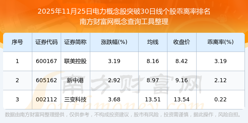 根據(jù)南方財富網(wǎng)概念查詢工具數(shù)據(jù)統(tǒng)計,截止2025年11月25日收盤,電力概念股共有3只個股收盤價向上突破了30日線。其中乖離率較大的個股有聯(lián)美控股、新中港、三變科技等,乖離率分別為3.19%、2.12%、0.22%。