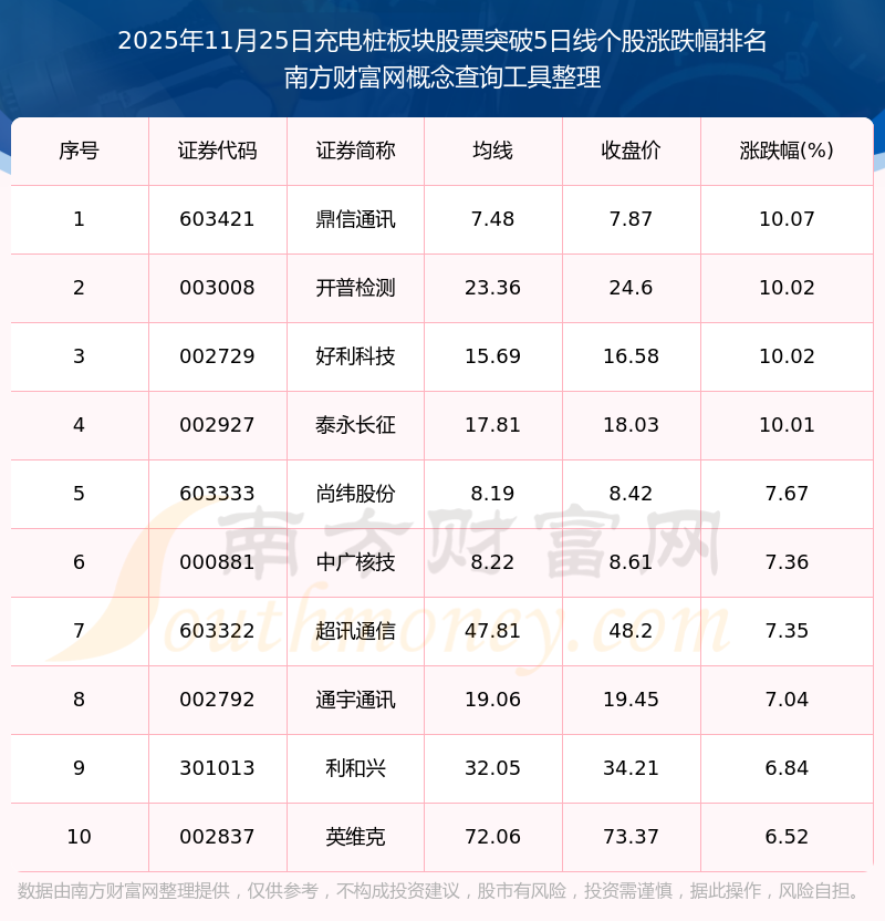 根據(jù)南方財(cái)富網(wǎng)概念查詢工具數(shù)據(jù)統(tǒng)計(jì),截止2025年11月25日收盤,充電樁板塊股票共有20只個(gè)股收盤價(jià)向上突破了5日線。其中漲幅較大的個(gè)股有鼎信通訊、好利科技、開普檢測(cè)等,漲幅分別為10.07%、10.02%、10.02%。