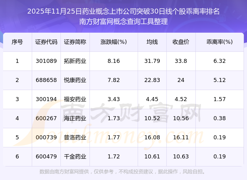 2025年11月25日藥業(yè)概念上市公司突破30日線個股乖離率排名