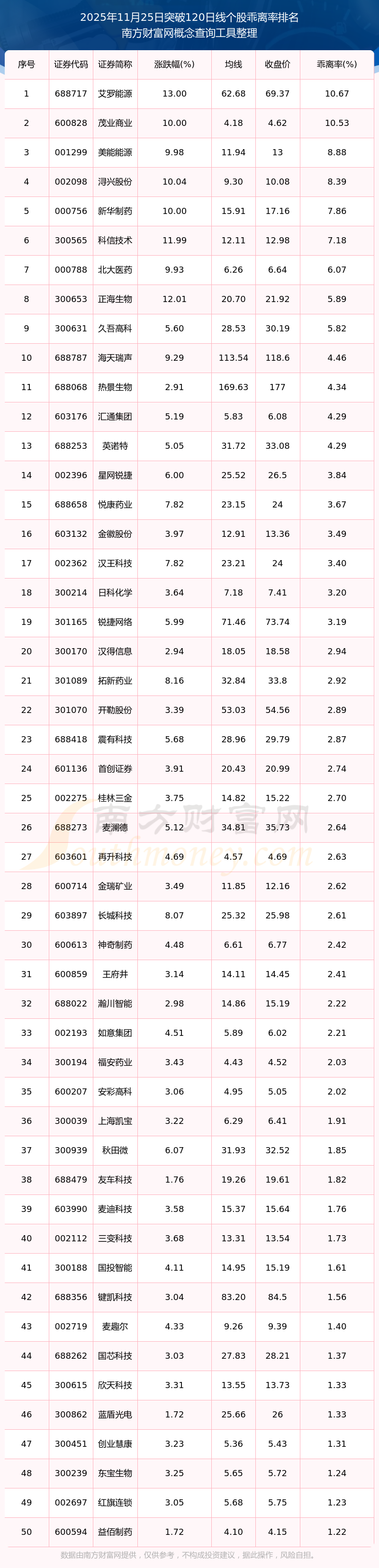 根據(jù)南方財富網(wǎng)概念查詢工具數(shù)據(jù)統(tǒng)計,截止2025年11月25日收盤,共有62只個股收盤價向上突破了120日線,其中乖離率較大的個股有艾羅能源、茂業(yè)商業(yè)、美能能源、潯興股份、新華制藥等,乖離率分別為10.67%、10.53%、8.88%、8.39%、7.86%。