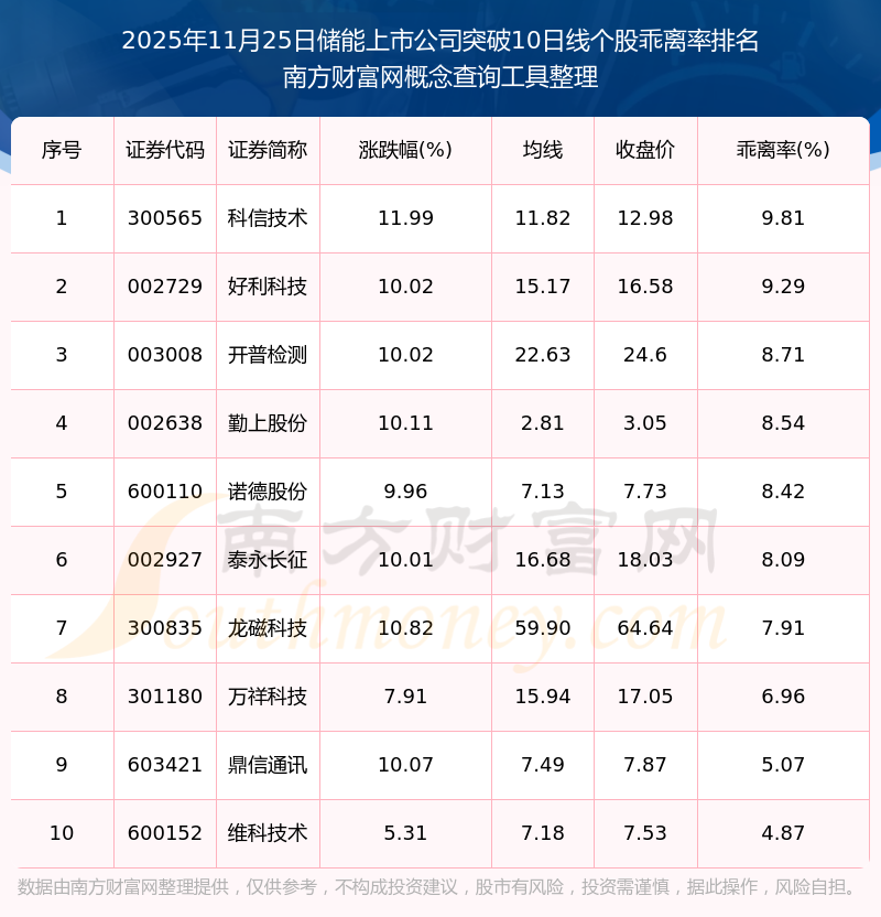 2025年11月25日儲(chǔ)能上市公司突破10日線個(gè)股乖離率排名