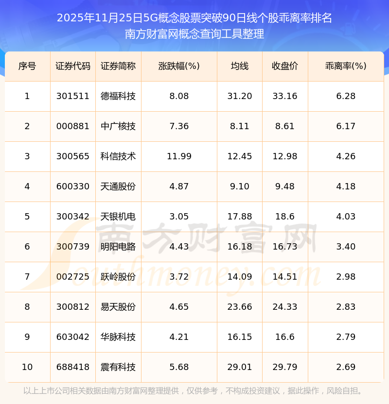 根據(jù)南方財富網(wǎng)概念查詢工具數(shù)據(jù)統(tǒng)計,截止2025年11月25日收盤,5G概念股票共有19只個股收盤價向上突破了90日線。其中乖離率較大的個股有德?萍肌⒅袕V核技、科信技術等,乖離率分別為6.28%、6.17%、4.26%。