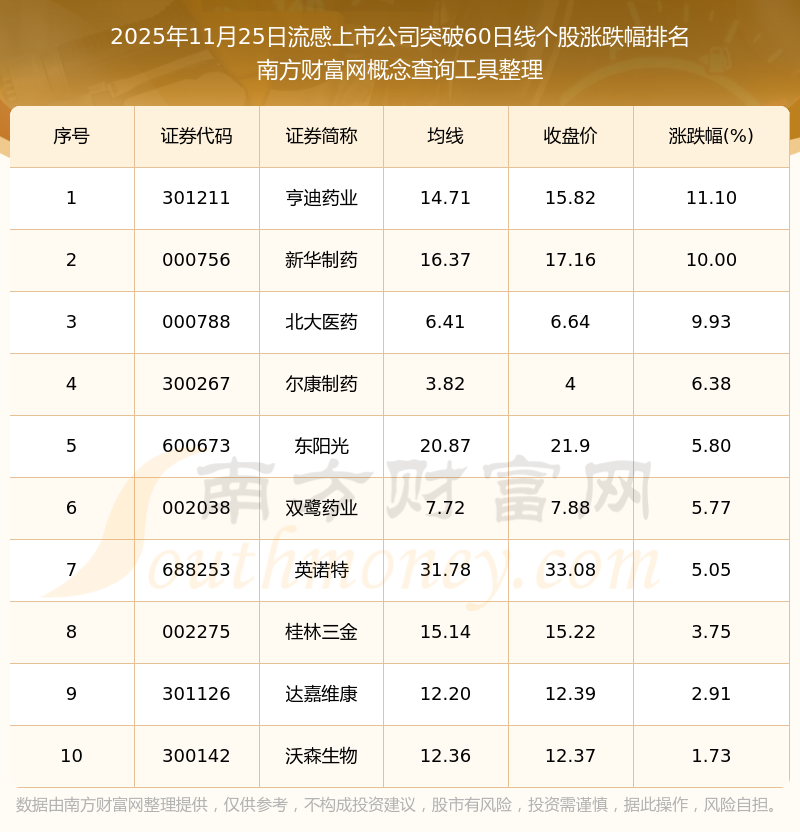 2025年11月25日流感上市公司突破60日線個(gè)股漲跌幅排名