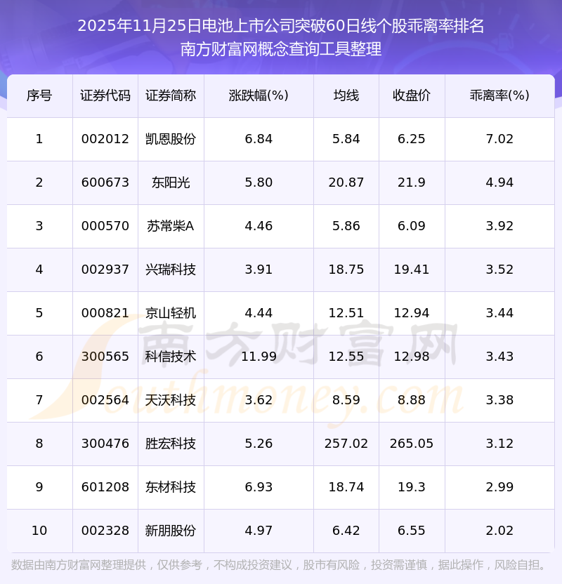 根據(jù)南方財(cái)富網(wǎng)概念查詢工具數(shù)據(jù)統(tǒng)計(jì),截止2025年11月25日收盤,電池上市公司共有17只個(gè)股收盤價(jià)向上突破了60日線。其中乖離率較大的個(gè)股有凱恩股份、東陽(yáng)光、蘇常柴A等,乖離率分別為7.02%、4.94%、3.92%。