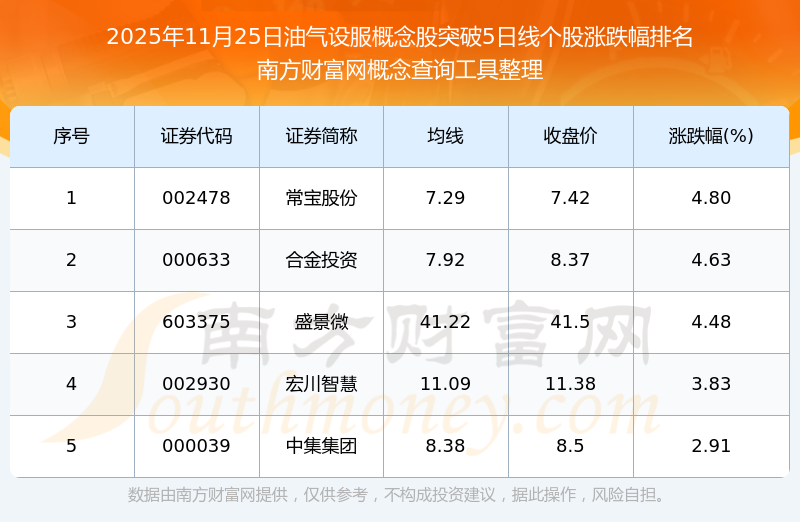 根據(jù)南方財富網(wǎng)概念查詢工具數(shù)據(jù)統(tǒng)計,截止2025年11月25日收盤,油氣設服概念股共有5只個股收盤價向上突破了5日線。其中漲幅較大的個股有常寶股份、合金投資、盛景微等,漲幅分別為4.80%、4.63%、4.48%。