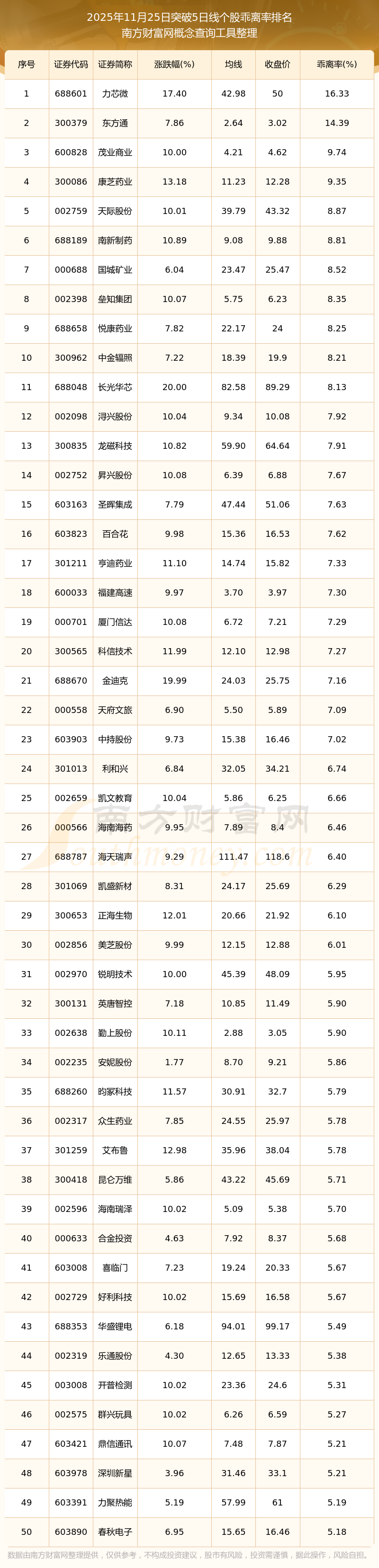 2025年11月25日突破5日線個(gè)股乖離率排名