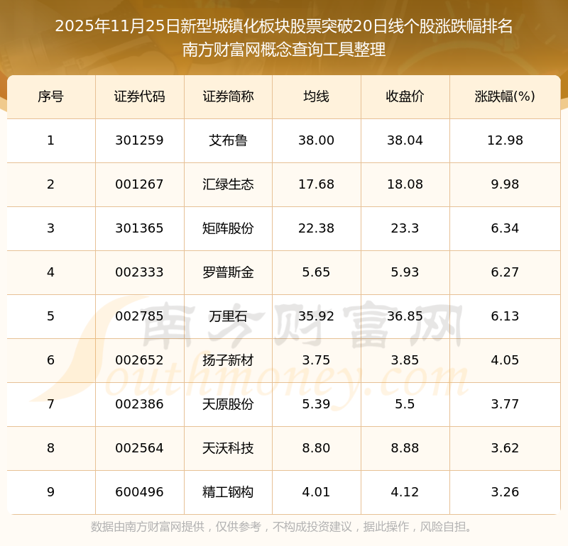 2025年11月25日新型城鎮(zhèn)化板塊股票突破20日線個股漲跌幅排名