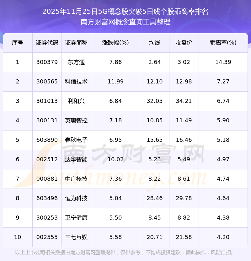 2025年11月25日5G概念股突破5日線個(gè)股乖離率排名