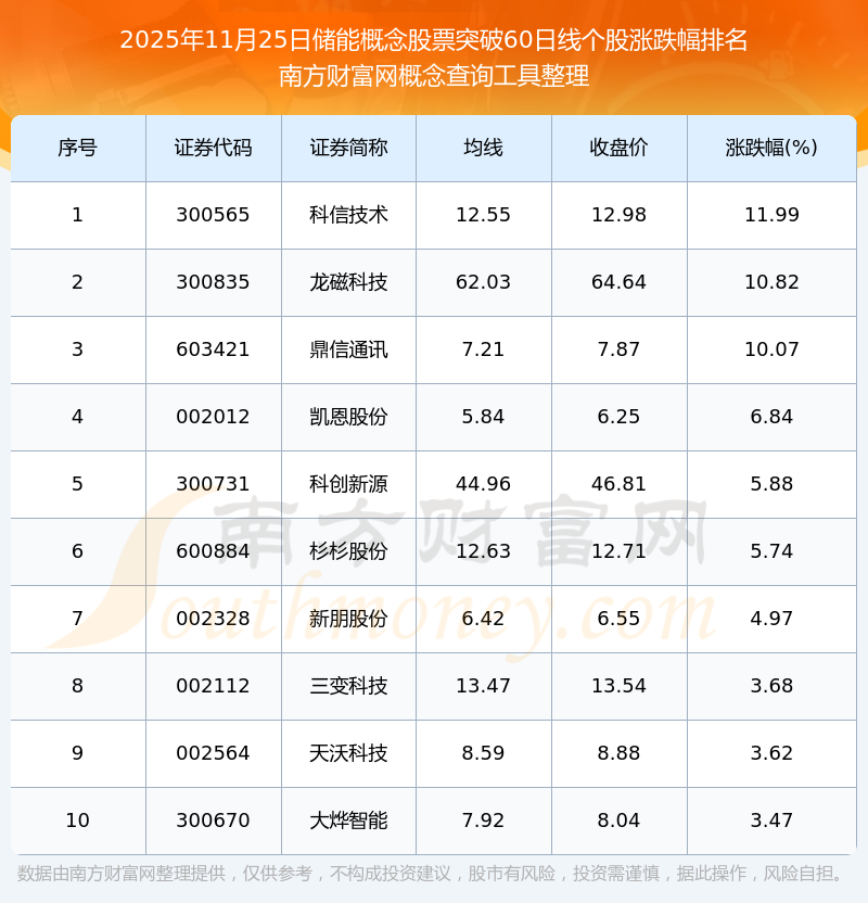 根據(jù)南方財富網(wǎng)概念查詢工具數(shù)據(jù)統(tǒng)計,截止2025年11月25日收盤,儲能概念股票共有12只個股收盤價向上突破了60日線。其中漲幅較大的個股有科信技術(shù)、龍磁科技、鼎信通訊等,漲幅分別為11.99%、10.82%、10.07%。