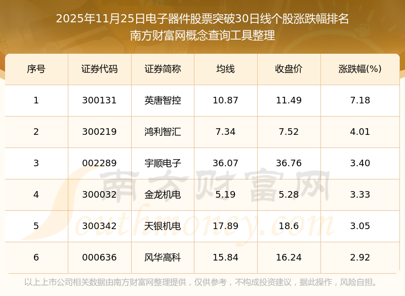 2025年11月25日電子器件股票突破30日線個(gè)股漲跌幅排名
