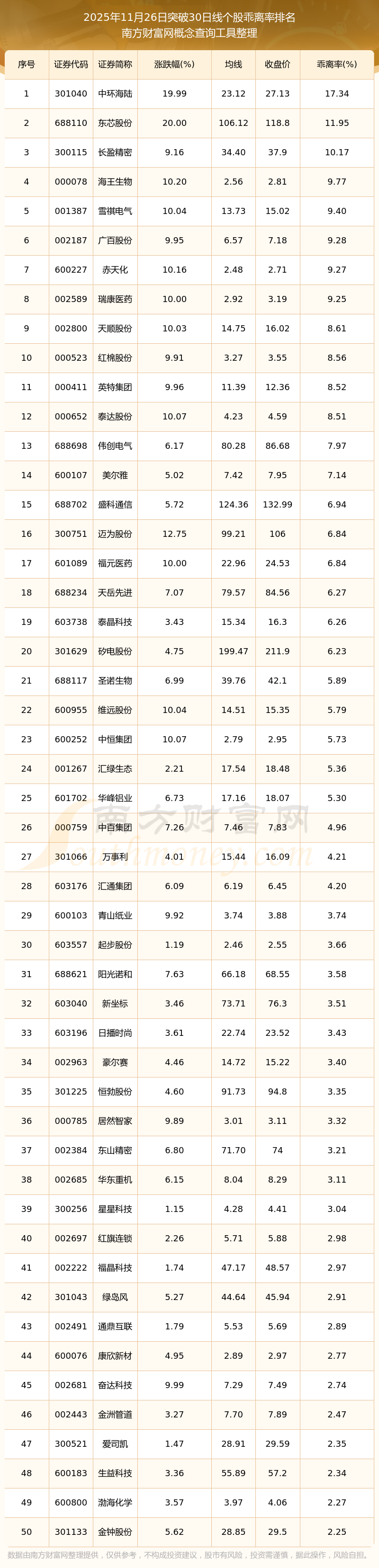 2025年11月26日突破30日線個(gè)股乖離率排名