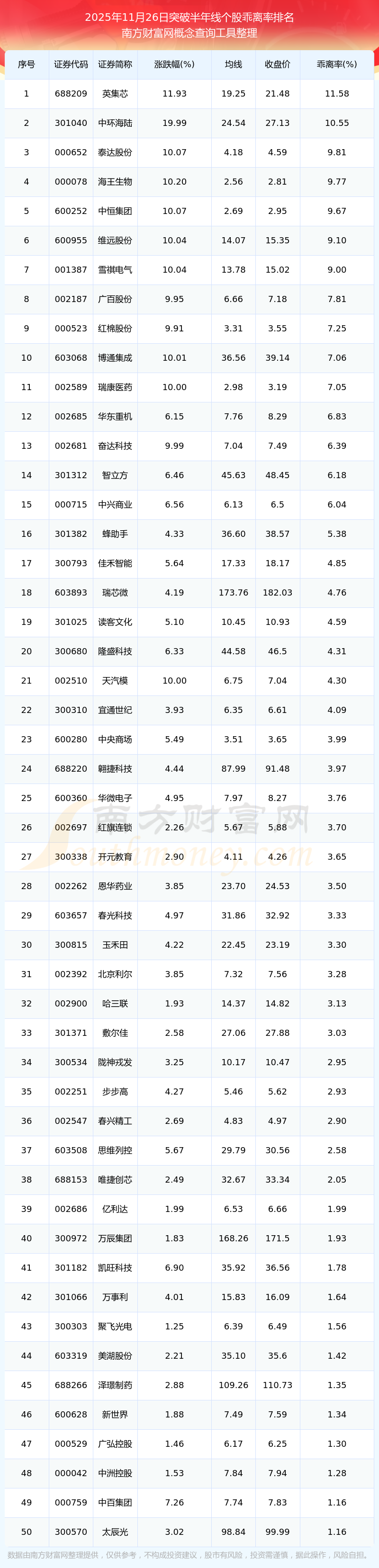 根據(jù)南方財富網(wǎng)概念查詢工具數(shù)據(jù)統(tǒng)計,截止2025年11月26日收盤,共有88只個股收盤價向上突破了120日線,其中乖離率較大的個股有英集芯、中環(huán)海陸、泰達股份、海王生物、中恒集團等,乖離率分別為11.58%、10.55%、9.81%、9.77%、9.67%。