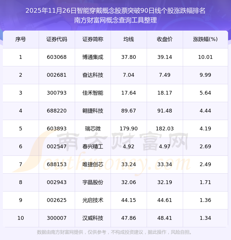 2025年11月26日智能穿戴概念股票突破90日線個股漲跌幅排名
