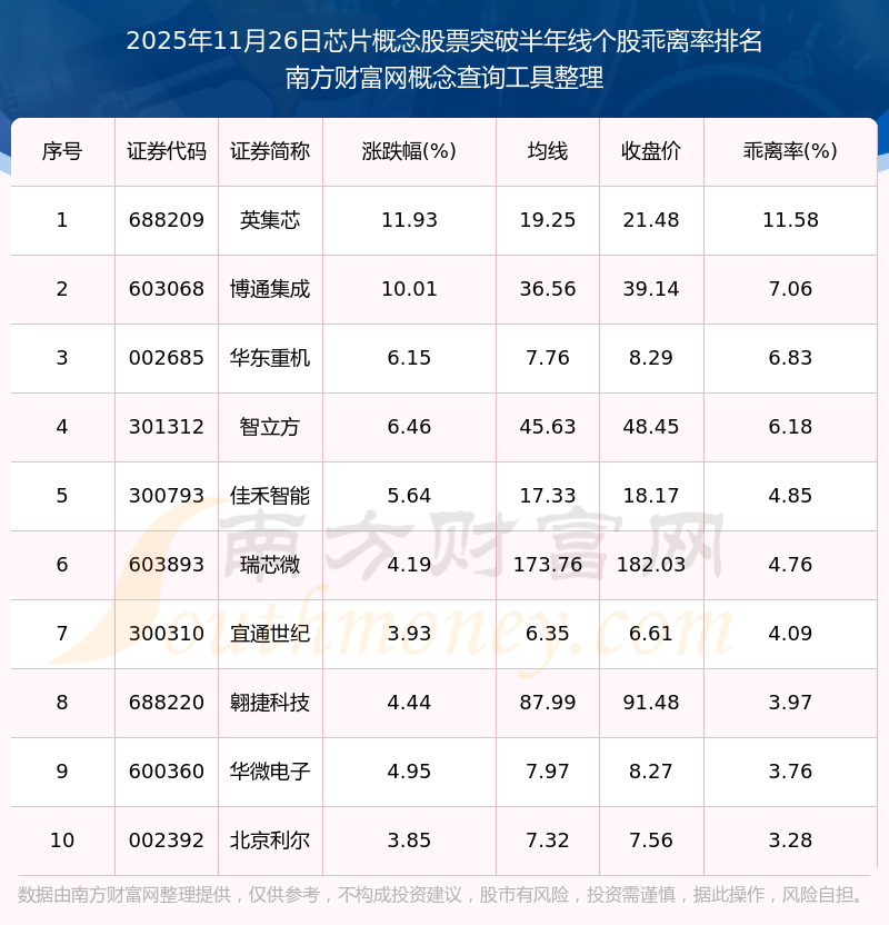 2025年11月26日芯片概念股票突破半年線個(gè)股乖離率排名