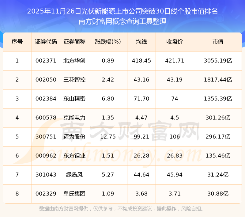 2025年11月26日光伏新能源上市公司突破30日線個(gè)股市值排名