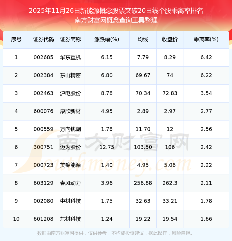 根據(jù)南方財(cái)富網(wǎng)概念查詢工具數(shù)據(jù)統(tǒng)計(jì),截止2025年11月26日收盤,新能源概念股票共有20只個(gè)股收盤價(jià)向上突破了20日線。其中乖離率較大的個(gè)股有華東重機(jī)、東山精密、滬電股份等,乖離率分別為6.42%、6.22%、3.54%。