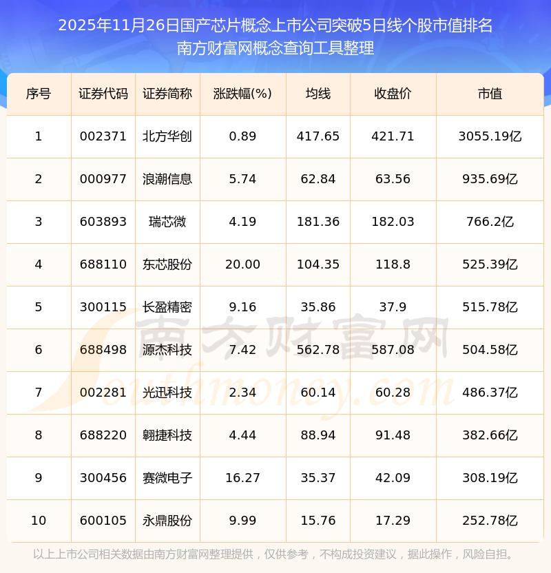 2025年11月26日國產(chǎn)芯片概念上市公司突破5日線個股市值排名