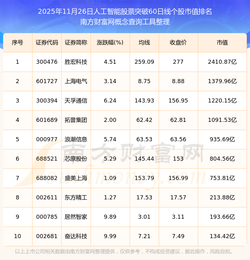 2025年11月26日人工智能股票突破60日線個(gè)股市值排名