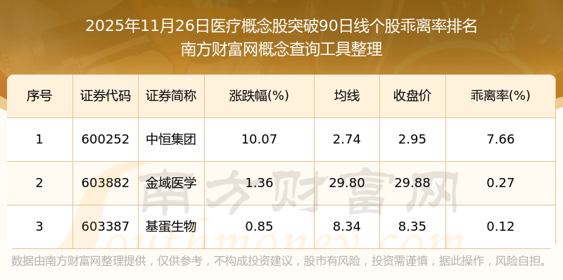 根據(jù)南方財(cái)富網(wǎng)概念查詢工具數(shù)據(jù)統(tǒng)計(jì),截止2025年11月26日收盤(pán),醫(yī)療概念股共有3只個(gè)股收盤(pán)價(jià)向上突破了90日線。其中乖離率較大的個(gè)股有中恒集團(tuán)、金域醫(yī)學(xué)、基蛋生物等,乖離率分別為7.66%、0.27%、0.12%。