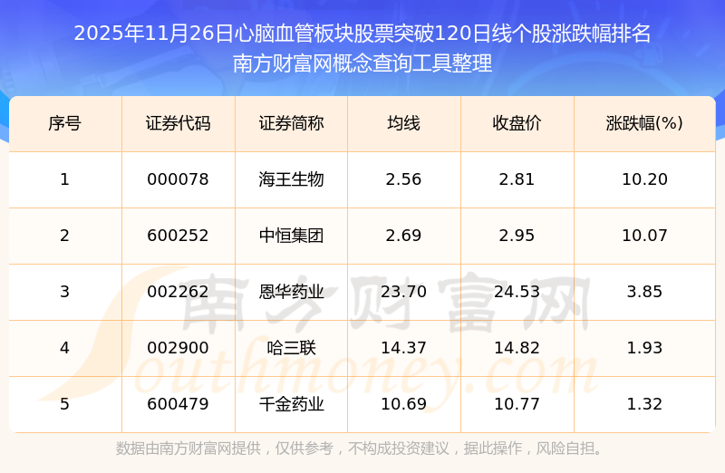 根據(jù)南方財富網(wǎng)概念查詢工具數(shù)據(jù)統(tǒng)計,截止2025年11月26日收盤,心腦血管板塊股票共有5只個股收盤價向上突破了120日線。其中漲幅較大的個股有海王生物、中恒集團、恩華藥業(yè)等,漲幅分別為10.20%、10.07%、3.85%。