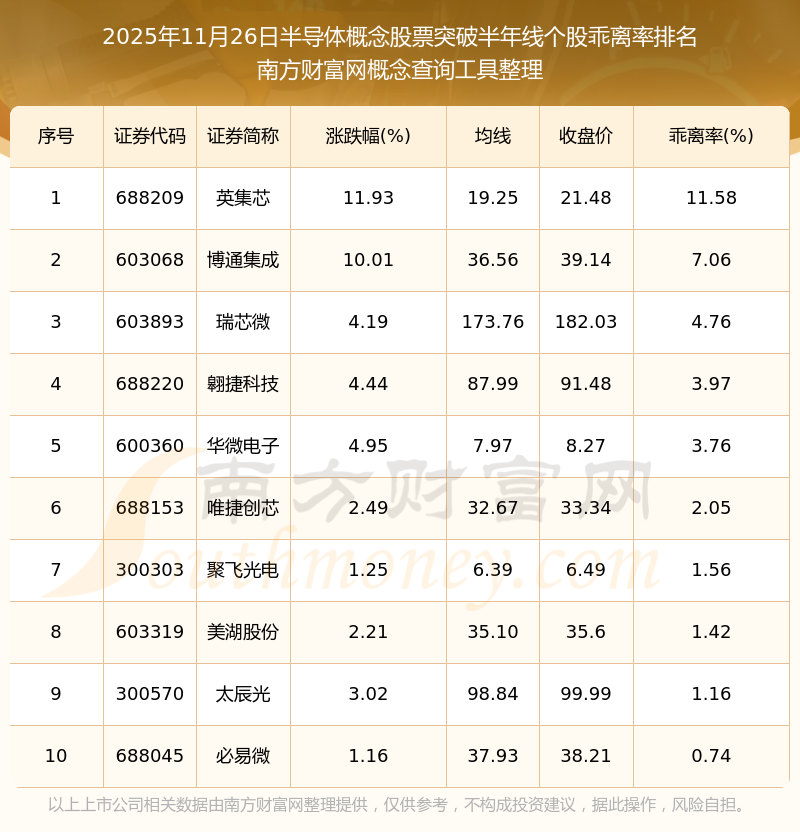 2025年11月26日半導(dǎo)體概念股票突破半年線個(gè)股乖離率排名