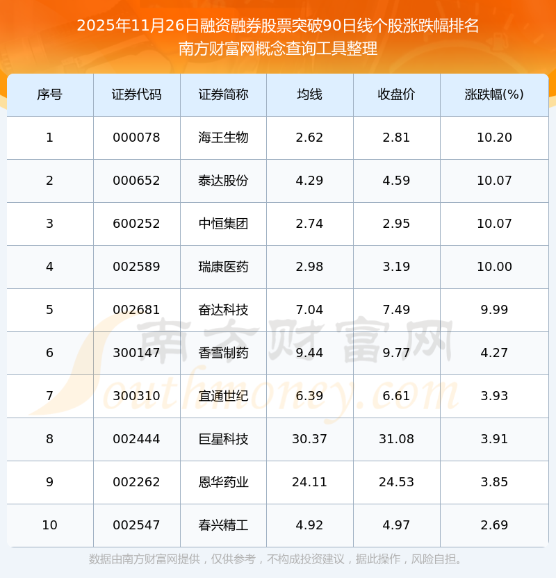 根據(jù)南方財(cái)富網(wǎng)概念查詢工具數(shù)據(jù)統(tǒng)計(jì),截止2025年11月26日收盤,融資融券股票共有26只個(gè)股收盤價(jià)向上突破了90日線。其中漲幅較大的個(gè)股有海王生物、中恒集團(tuán)、泰達(dá)股份等,漲幅分別為10.20%、10.07%、10.07%。