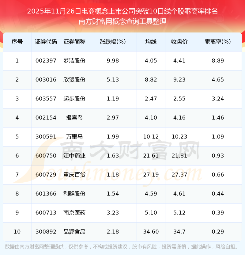 2025年11月26日電商概念上市公司突破10日線個(gè)股乖離率排名