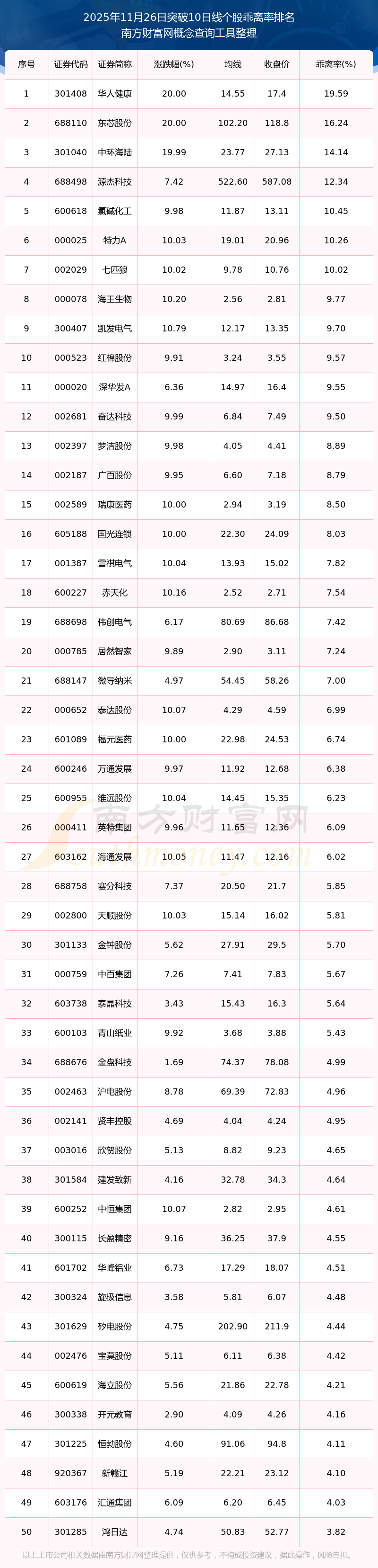 根據(jù)南方財富網(wǎng)概念查詢工具數(shù)據(jù)統(tǒng)計,截止2025年11月26日收盤,共有153只個股收盤價向上突破了10日線,其中乖離率較大的個股有華人健康、東芯股份、中環(huán)海陸、源杰科技、氯堿化工等,乖離率分別為19.59%、16.24%、14.14%、12.34%、10.45%。