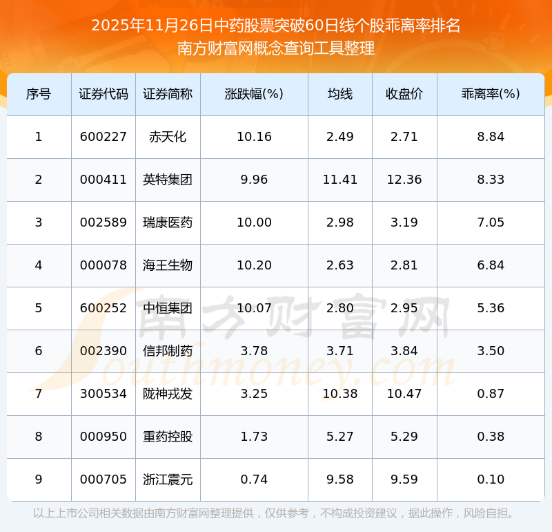 2025年11月26日中藥股票突破60日線(xiàn)個(gè)股乖離率排名