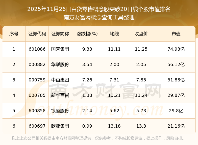 根據(jù)南方財富網(wǎng)概念查詢工具數(shù)據(jù)統(tǒng)計,截止2025年11月26日收盤,百貨零售概念股共有6只個股收盤價向上突破了20日線。其中市值較大的個股有國芳集團(tuán)、華聯(lián)股份、中百集團(tuán)等,市值分別為74.93億、56.12億、51.88億。