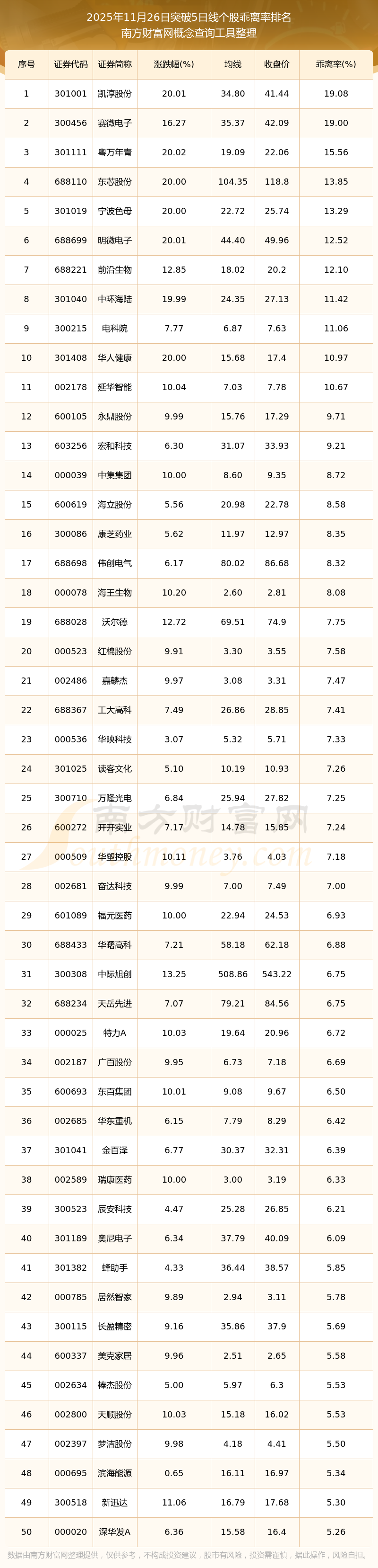 2025年11月26日突破5日線(xiàn)個(gè)股乖離率排名