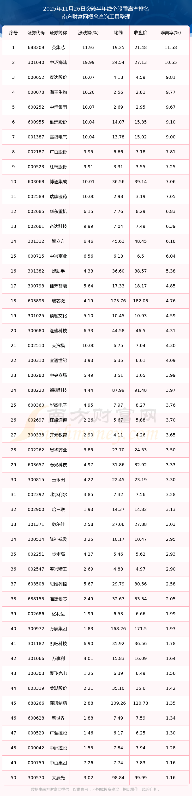 2025年11月26日突破120日線個(gè)股乖離率排名