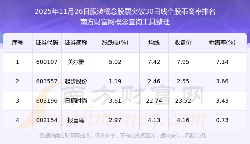 2025年11月26日服裝概念股票突破30日線個(gè)股乖離率排名