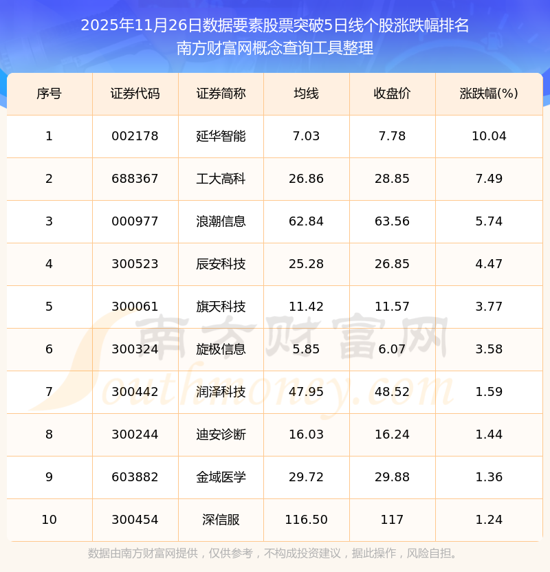 根據(jù)南方財(cái)富網(wǎng)概念查詢工具數(shù)據(jù)統(tǒng)計(jì),截止2025年11月26日收盤,數(shù)據(jù)要素股票共有10只個(gè)股收盤價(jià)向上突破了5日線。其中漲幅較大的個(gè)股有延華智能、工大高科、浪潮信息等,漲幅分別為10.04%、7.49%、5.74%。