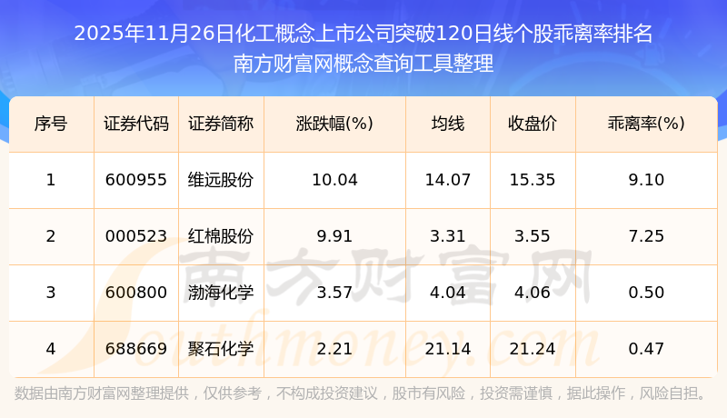 2025年11月26日化工概念上市公司突破120日線個(gè)股乖離率排名