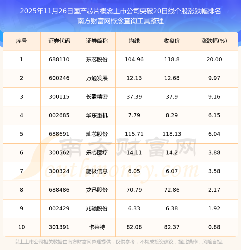 2025年11月26日國產(chǎn)芯片概念上市公司突破20日線個股漲跌幅排名