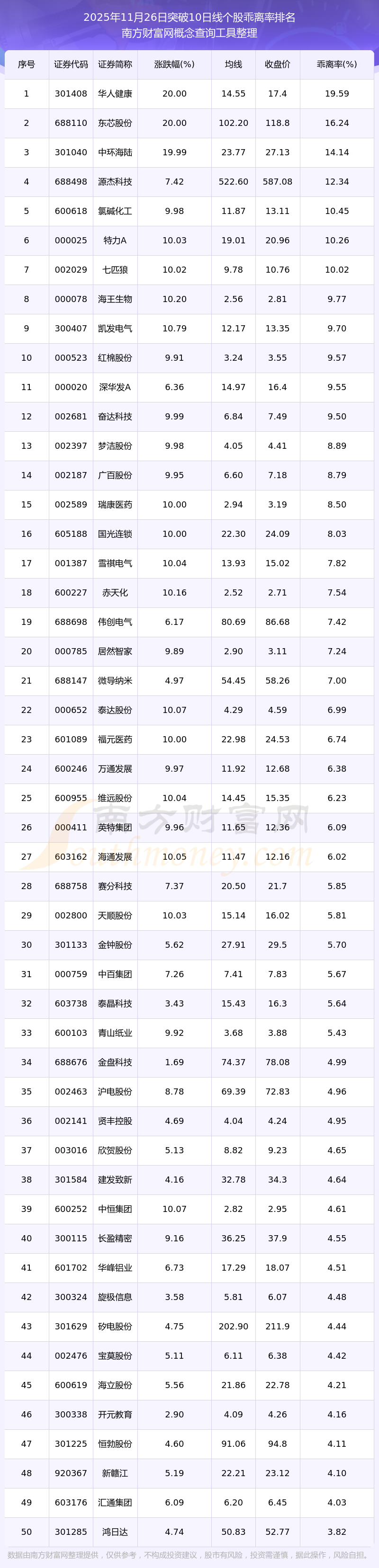 根據(jù)南方財富網(wǎng)概念查詢工具數(shù)據(jù)統(tǒng)計,截止2025年11月26日收盤,共有153只個股收盤價向上突破了10日線,其中乖離率較大的個股有華人健康、東芯股份、中環(huán)海陸、源杰科技、氯堿化工等,乖離率分別為19.59%、16.24%、14.14%、12.34%、10.45%。