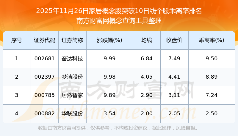 2025年11月26日家居概念股突破10日線個(gè)股乖離率排名