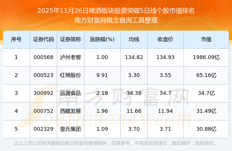 2025年11月26日啤酒板塊股票突破5日線個(gè)股市值排名