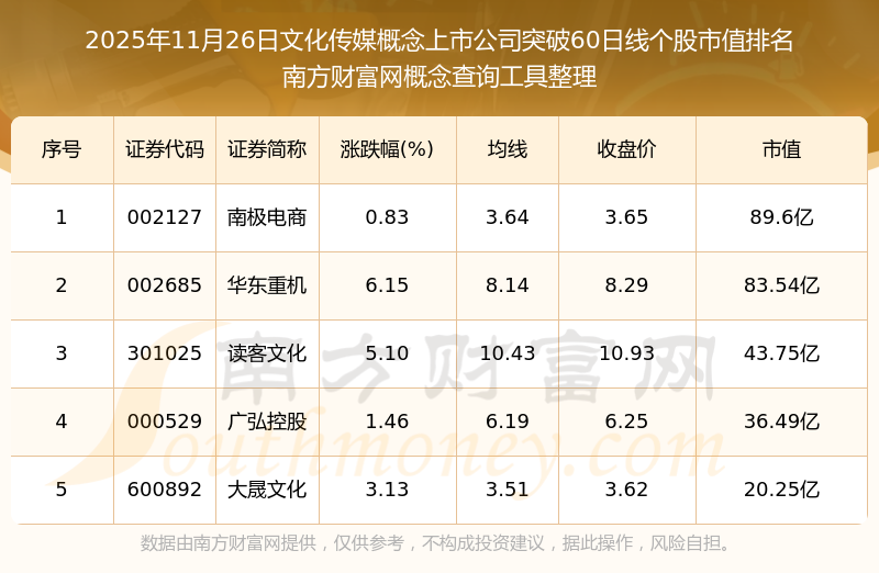 2025年11月26日文化傳媒概念上市公司突破60日線個(gè)股市值排名